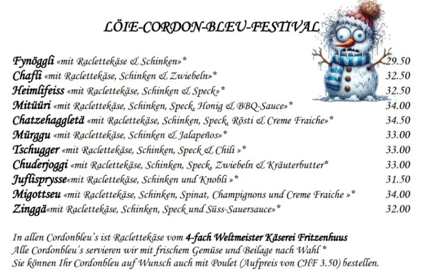 Seit dem 01.Juli 2023 hat Cindy den Löwen übernommen. Gut bürgerliche Küche mit diversen "Emmentaler" Cordon Bleu's. Sehr beleibt sind "FYNÖGGELI" / "CHUDERJOGGI" / "MIGOTTSEU". Speziell ist der Käse - es wird Racclettekäse vom 4-fach Weltmeister verwendet. Ist meiner Meinung nach ein Abstecher ins Emmental wert. Reservierung empfohlen.